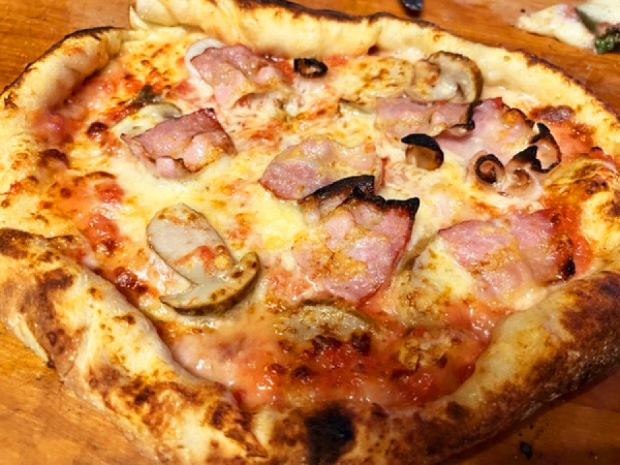 Roll out the dough in a round shape. Put some mozzarella cheese and parmesan around the perimeter. Cover the edges with the dough. Add the tomato, Parmesan and the porcini slices. Then cover with mozzarella and the bacon slices.